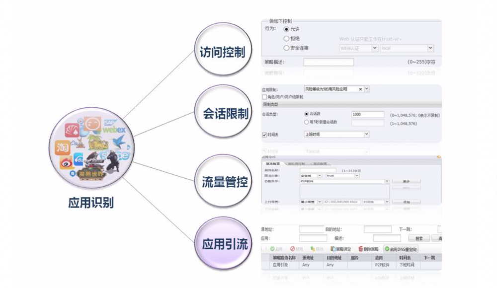 ●灵活应用控制。基于深度应用识别及精细化的应用筛选,evo视讯真人官网下一代防火墙支持灵活的安全控制功能。包括策略阻止、会话限制、流量管控、应用引流或时间限制等。