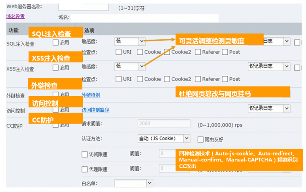 ● 支持专业的Web Server防御及CC攻击防御等